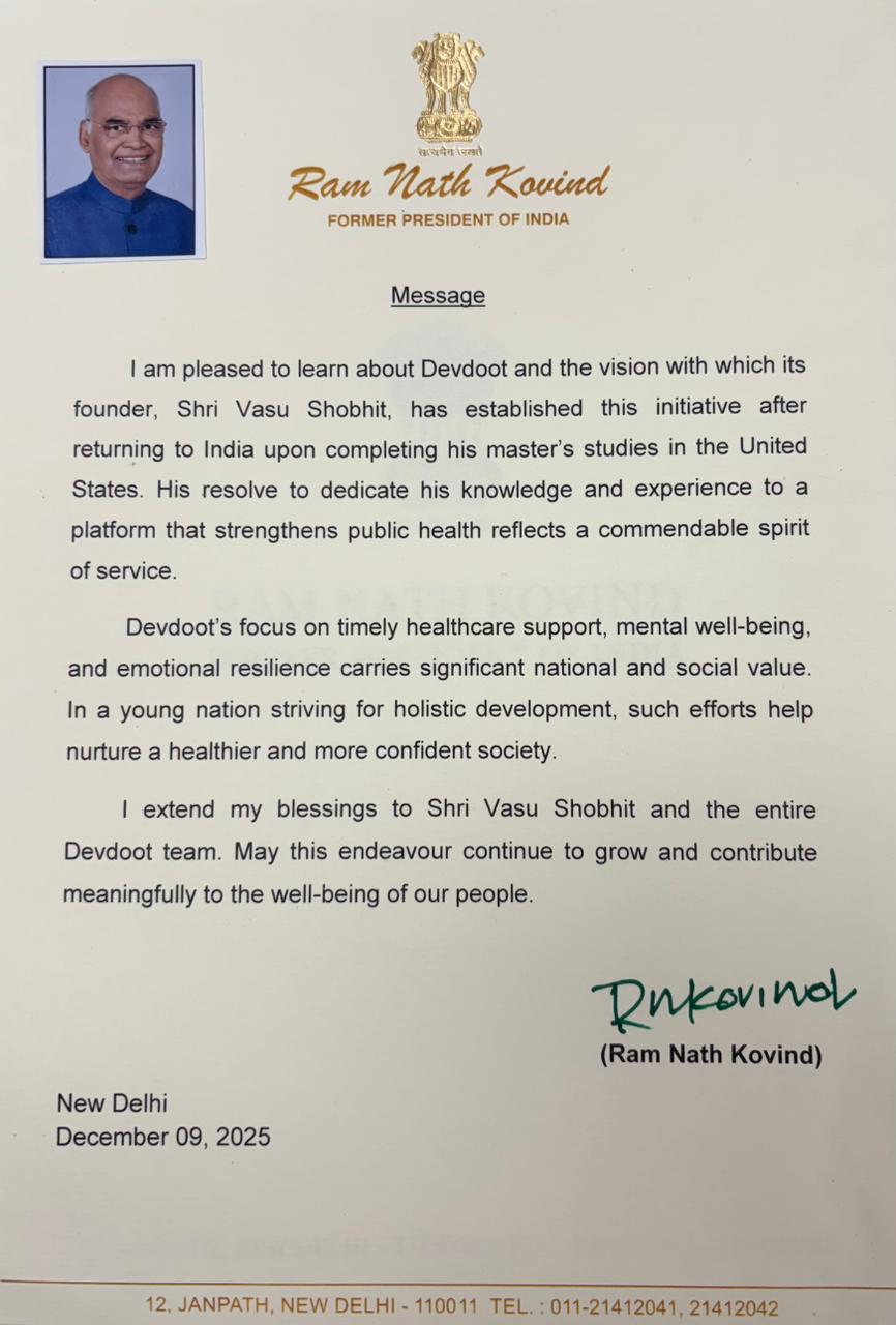 In his letter, Shri Kovind acknowledges Devdoot’s vision and its commitment to strengthening public health through timely healthcare support, mental well-being, and emotional resilience initiatives. He recognises the organisation’s purpose-driven approach and its contribution toward building a healthier, more confident, and resilient society.